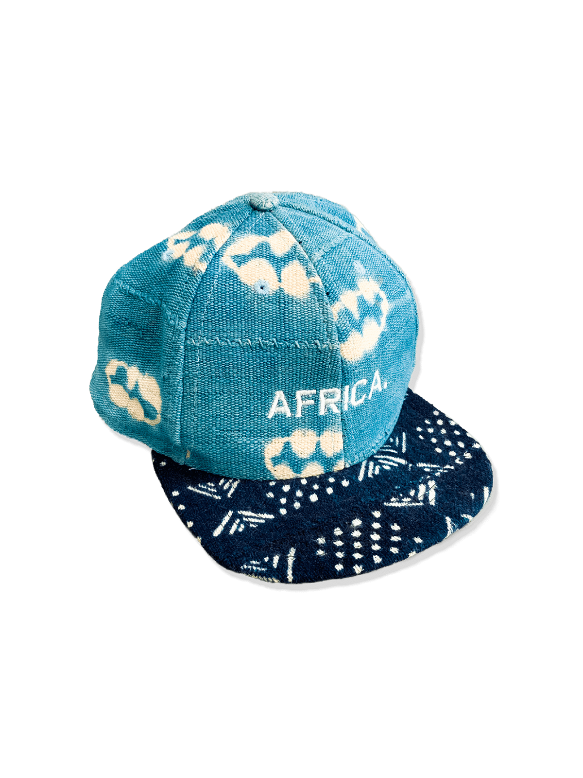 The visor features another distinct West African textile, often dyed in deep indigo with hand-painted or resist-dyed patterns, reflecting the artistry of Mali, Burkina Faso, or Côte d’Ivoire. The combination of crown and visor creates a visual dialogue between different textile traditions, making each cap truly one-of-a-kind.