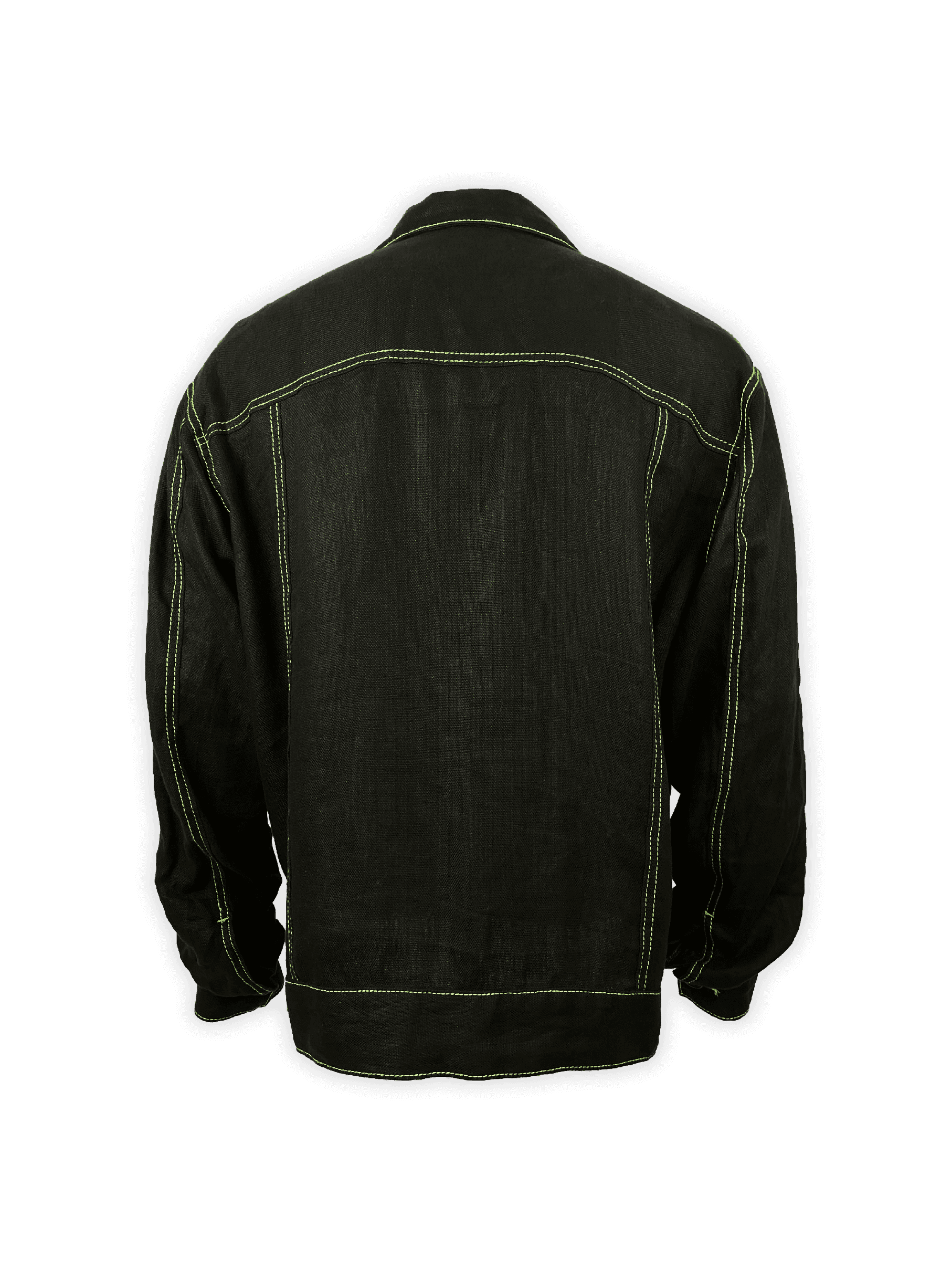 One of the standout features of this black linen trucker jacket is the green contrast stitching that runs along the seams. Instead of blending in, the stitching highlights the jacket’s construction, emphasizing craftsmanship and giving it an urban, avant-garde aesthetic. The green thread pops against the deep black linen, creating a dynamic look that sets this trucker apart from standard outerwear.