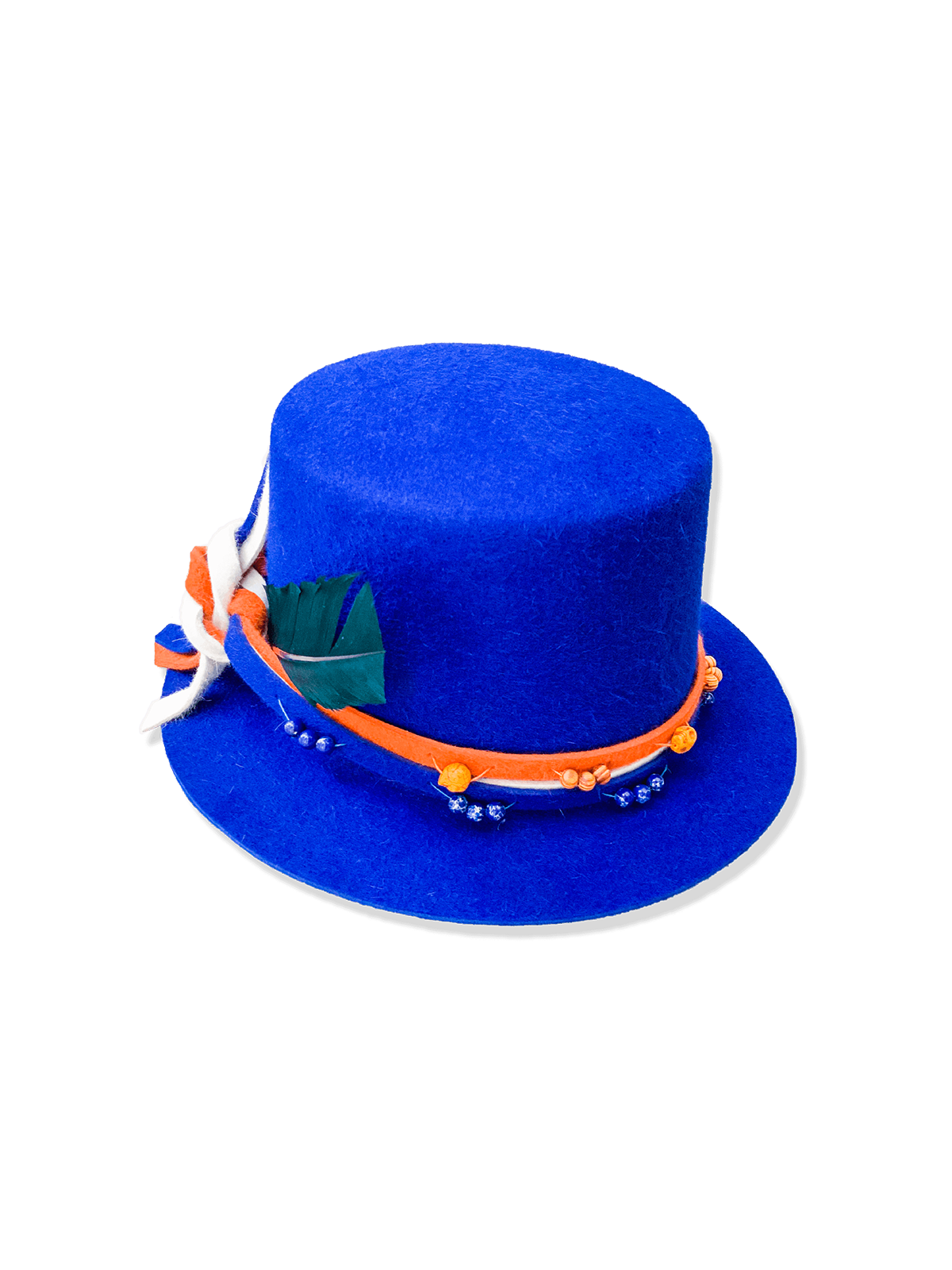 • Vibrant Design: Electric blue base with orange hatband, green feather, and beaded detailing.
