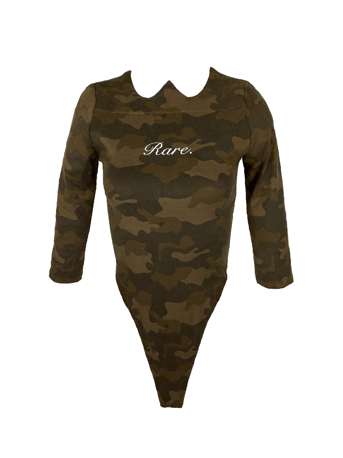While the inspiration behind the bodysuit is rooted in the utilitarian structure of a traditional military uniform, RCSLA elevates it through premium materials and precise tailoring. The camo pattern evokes resilience and readiness, but the execution — slim fit, artistic cut, luxurious twill — positions the piece firmly within the realm of high fashion.