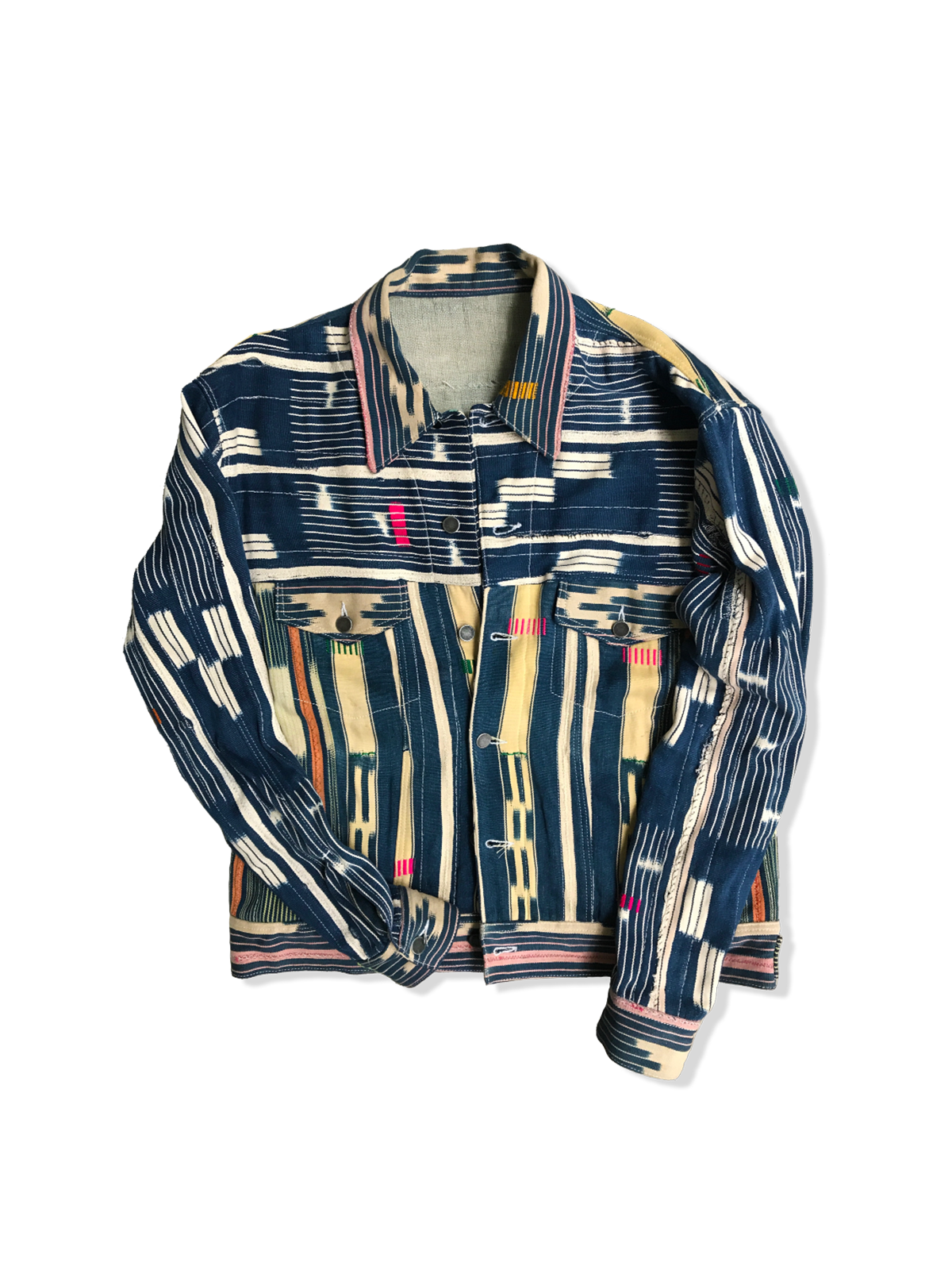 Each jacket is 1-of-1—crafted from authentic Baoulé fabric handwoven in Côte d’Ivoire, making it truly one of a kind. The bold geometric patterns and carefully placed pops of color are a testament to centuries-old weaving techniques passed down through generations of Ivorian artisans.