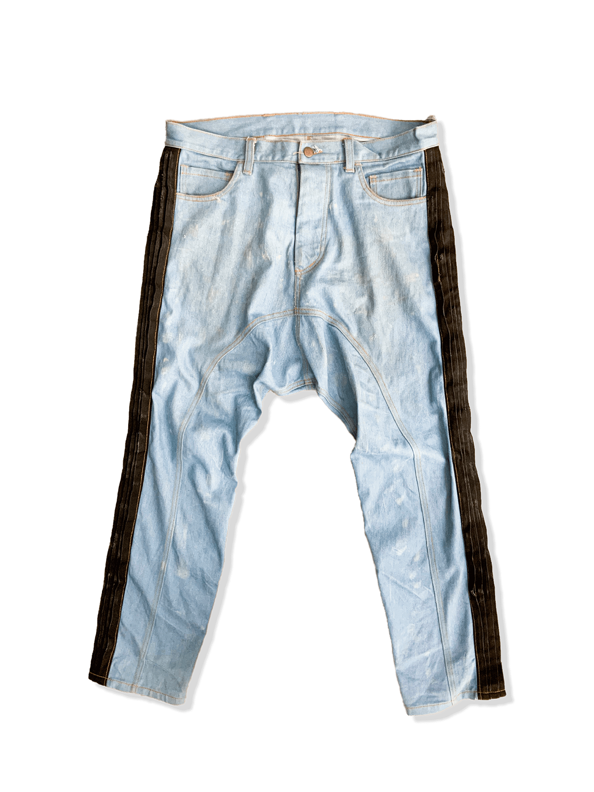 Elevating the design is the addition of pleated black denim side panels, a detail that provides both contrast and textural intrigue. These panels run the length of the pants, elongating the leg line while adding a touch of refinement to the relaxed silhouette. The pleating technique, a labor-intensive process, underscores the craftsmanship and attention to detail that defines every RCSLA piece.