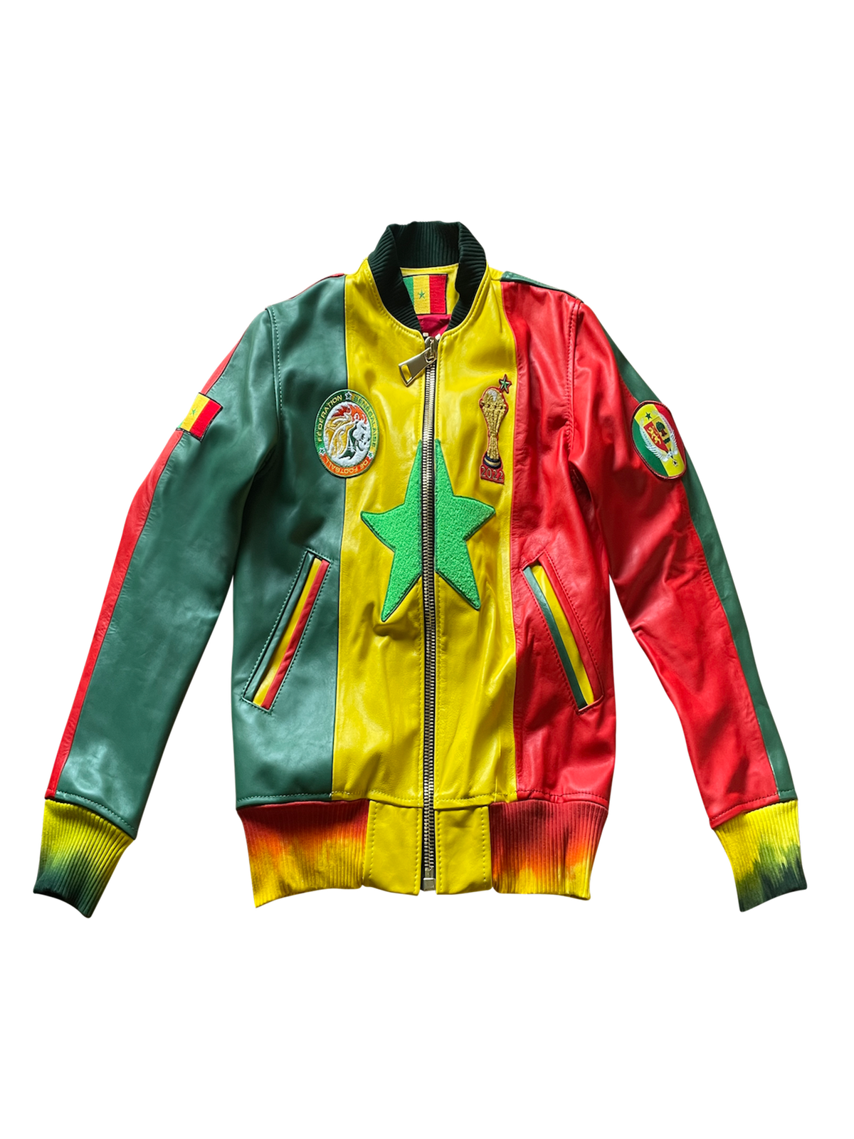 Crafted from 100% premium soft lambskin leather, this luxury bomber jacket is rendered in bold vertical panels of green, yellow, and red — the unmistakable colors of the Senegalese flag. At the center of the front and back, an oversized textured green star makes a striking impact, honoring Senegal’s national emblem.