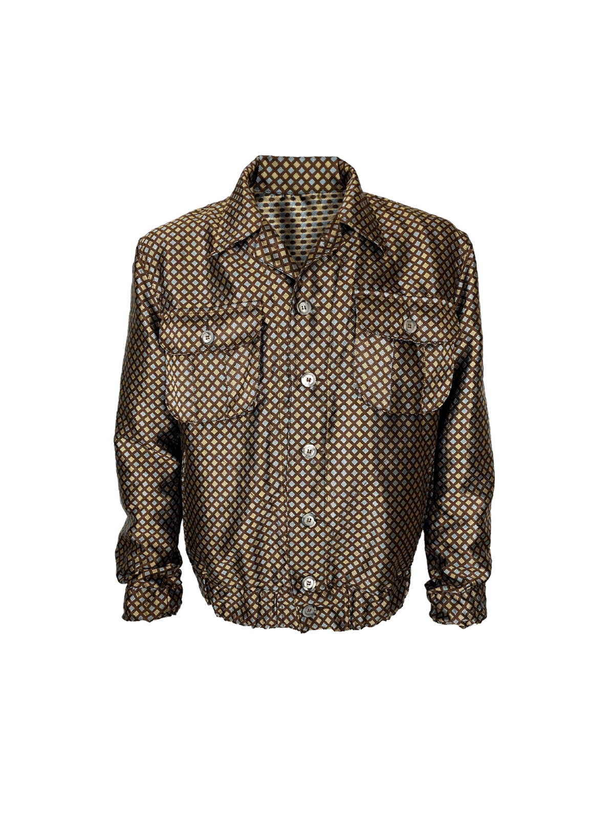 The Statement Silk Brocade Jacket is a refined expression of modern tailoring and traditional textile art. Made from high-quality silk brocade fabric, this jacket is designed for those who appreciate elegance, craftsmanship, and bold individuality. Its shimmering brown and gold motif creates a luxurious feel, while the cropped cut keeps the silhouette youthful, edgy, and versatile.