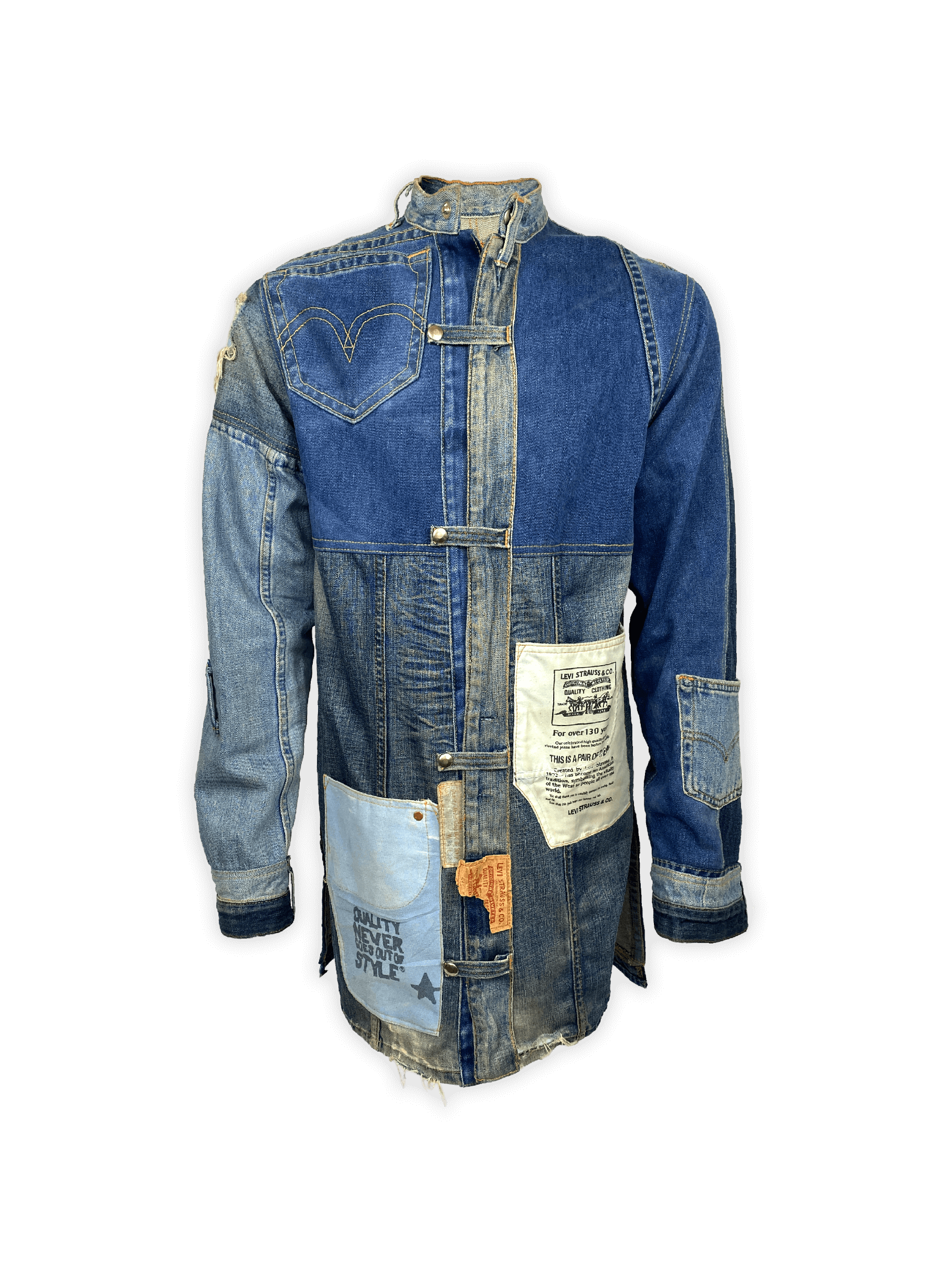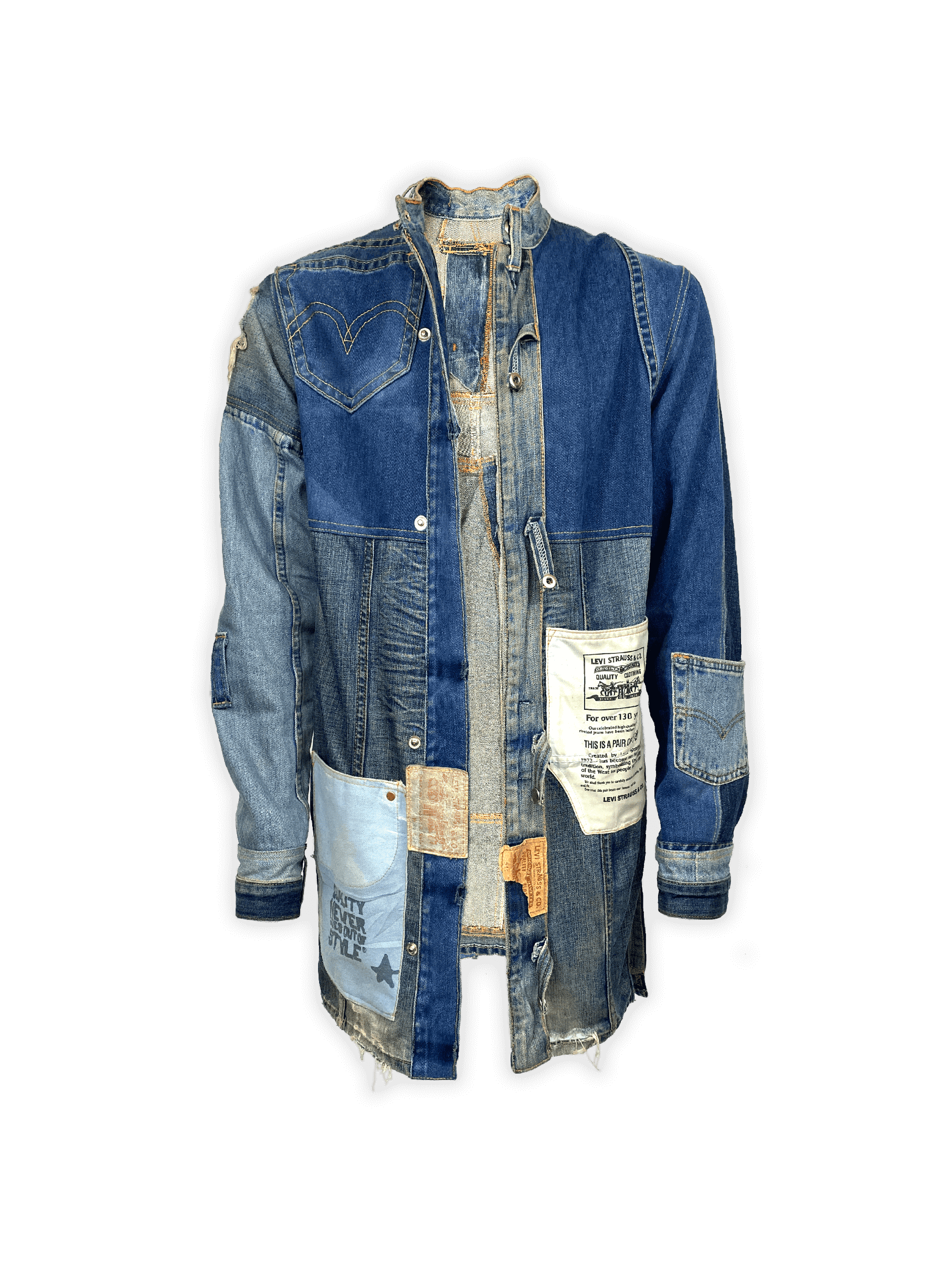 This jacket represents a powerful blend of artisanal skill and eco-conscious design. The denim used is sourced from discarded jeans and jackets, reimagined through hours of careful deconstruction and reconstruction. The result is a jacket that tells a layered story—one of fashion’s past, present, and future.